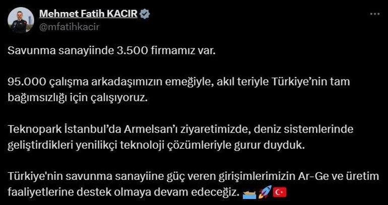 Ziyaret sonrası sosyal medya üzerinden yaptığı açıklamada, Türkiye genelinde savunma sanayisi alanında faaliyet gösteren 3 bin 500 firma bulunduğunu ve bu sektörde 95 bin kişinin özveriyle çalıştığını belirtti. Bakan Kacır, Türkiye’nin savunma alanında tam bağımsızlık hedefi doğrultusunda önemli adımlar atıldığını vurguladı.
