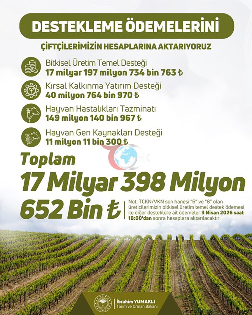 Paylaşımda verilen bilgilere göre, 17 milyar 197 milyon 734 bin 763 lira bitkisel üretim temel desteği, 40 milyon 764 bin 970 lira kırsal kalkınma yatırım desteği, 149 milyon 140 bin 967 lira hayvan hastalıkları tazminatı ve 11 milyon 11 bin 300 lira hayvan gen kaynakları desteği ödenecek.