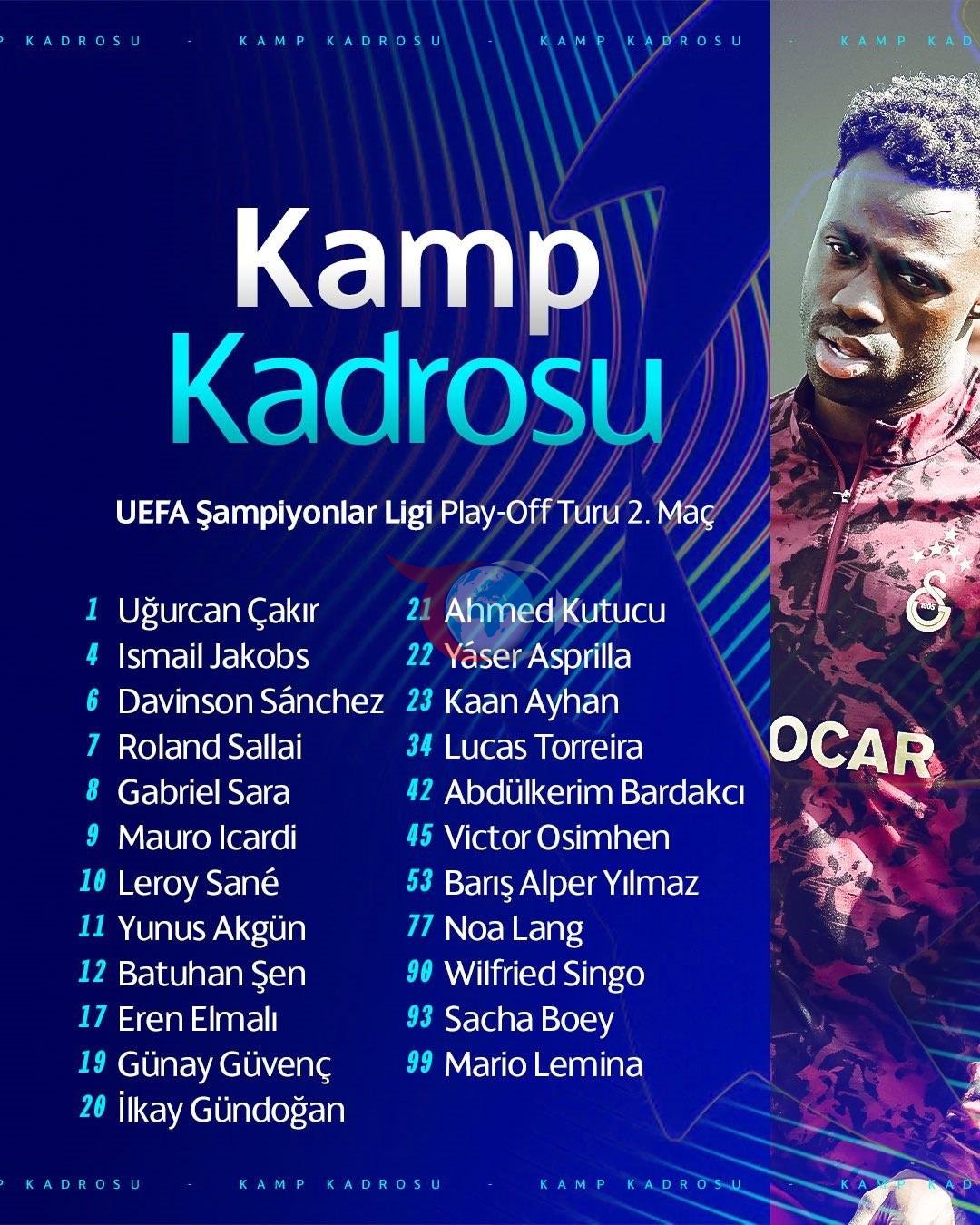 Galatasaray'ın yıldız oyuncusu Victor Osimhen, Juventus maçı kadrosuna dahil edildi. Osimhen, daha önce Süper Lig'de oynanan Konyaspor karşılaşmasında forma giymemiş, kulüp bu durumu tedbir amaçlı olarak açıklamıştı. Ancak, yıldız futbolcu kritik Juventus maçında takımındaki yerini alacak. UEFA'ya bildirilen listede yer almayan Arda Ünyay, Renato Nhaga ve Can Armando Güner ise bu maç için kadroya dahil edilmedi.
