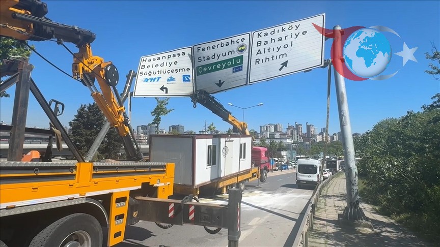 İstanbul'da yaşanan olayda konteyner yüklü vincin bomu başüstü yönlendirme levhasına çarptı, polis ekipleri önlem aldı ve levha kurtarıldı.