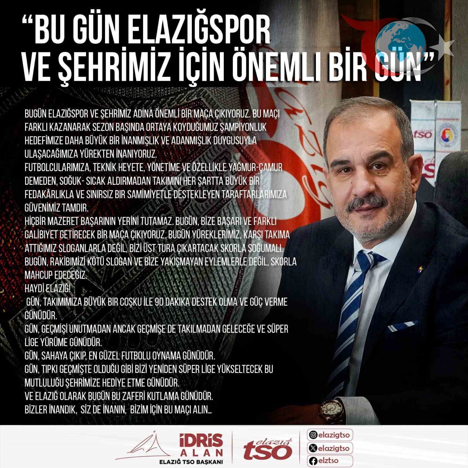 Elazığ Ticaret ve Sanayi Odası Başkanı İdris Alan, Elazığspor'un kritik maçı öncesi önemli açıklamalarda bulundu.