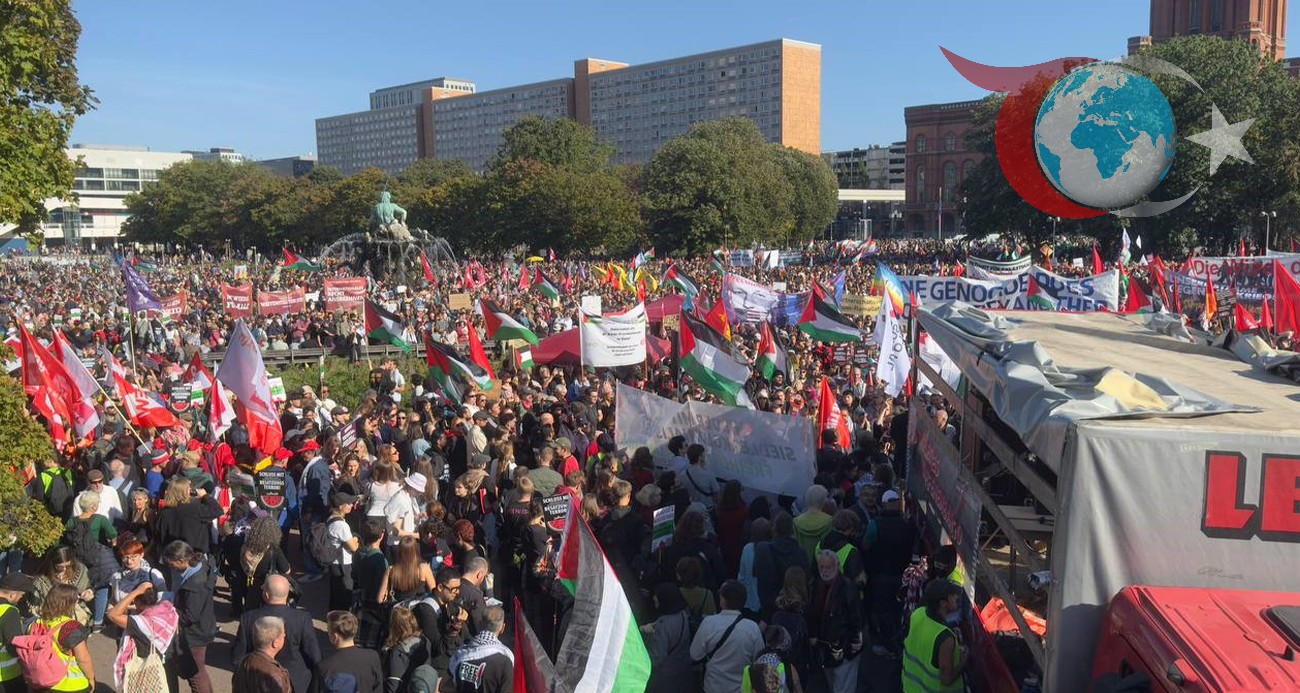 Berlin'de düzenlenen ve şimdiye kadar en fazla katılım sağlanan Filistin'e destek gösterisi, binlerce kişinin katılımıyla gerçekleşti.