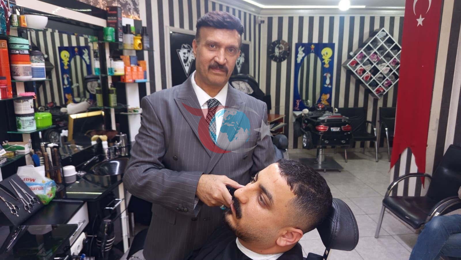 47 yıllık berber Selahattin Aslan, kravat ve takım elbise ile hizmet vererek müşterilerinin beğenisini kazanıyor.